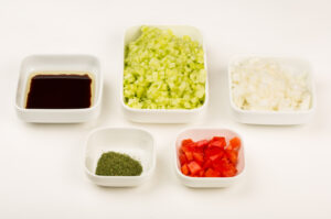 • Peel and trim cucumber and onion. Remove core from tomatoes. Dice vegetables into a uniform size.