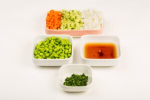 • Defrost edamame beans. Peel English cucumber, carrots and onions and dice in a uniformly small size. Wash and finely chop cilantro (or parsley).