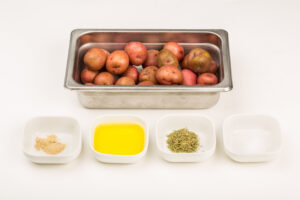 - Wash potatoes and transfer to ½ size- 2” deep production pans. Add ½ pan of water. Cover with plastic wrap and aluminum foil.