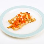 - Bulk: in ½ size- 2” deep production pans portion out 50gm of chicken and place 70 gm of tomato filling on top of each portion. Cover with plastic wrap and aluminum foil. Place pan in Multigen for 50 minutes.Cold Plating: on a service plate, portion out 50gm of chicken and place 70 gm of tomato filling on top of chicken. Add a side to the dish. Place on the hot side of the tray to retherm prior to service.